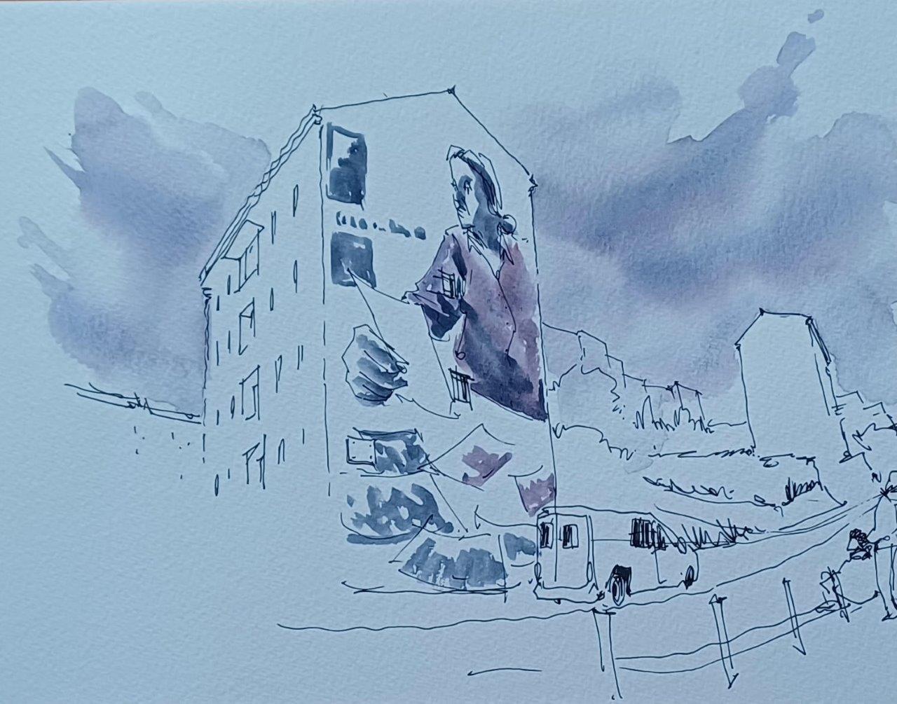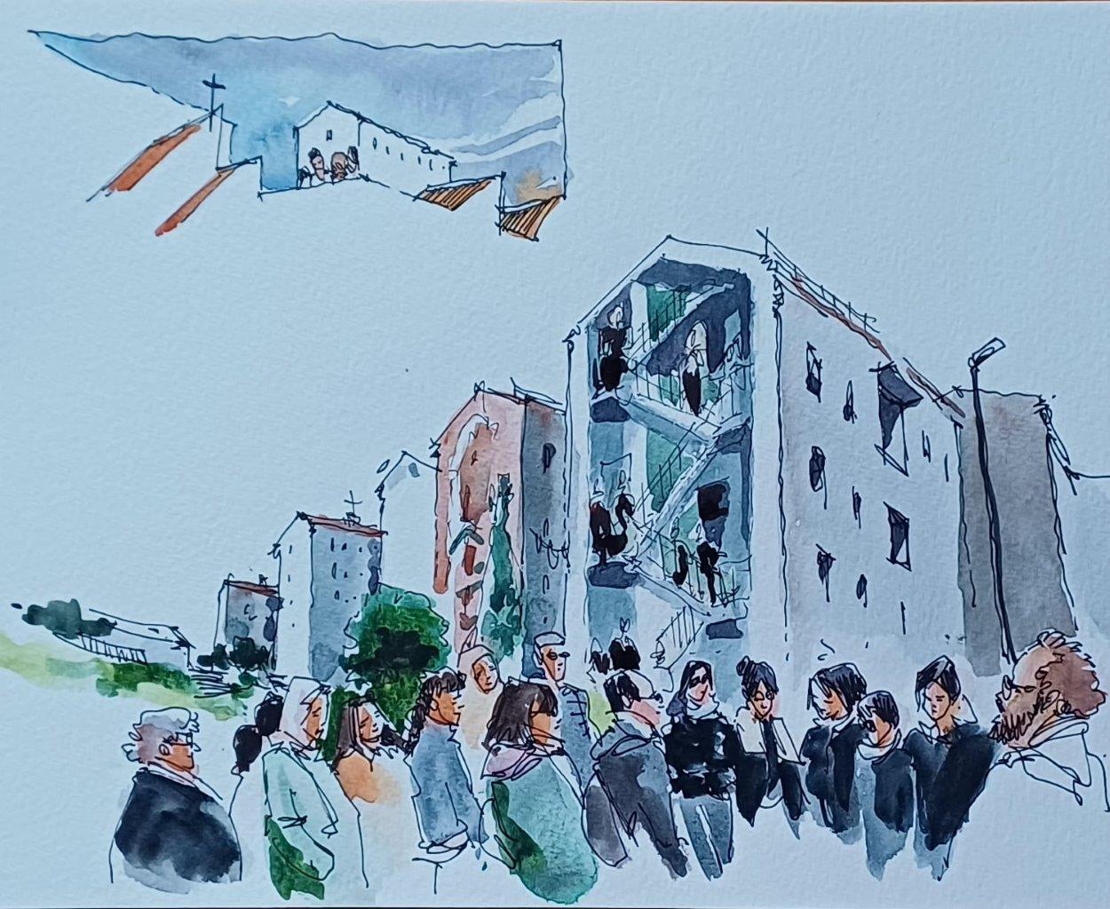 Durante o percurso pelo bairro 2 de Maio, foram registados vários momentos em desenho, a partir da observação direta da realidade local.
